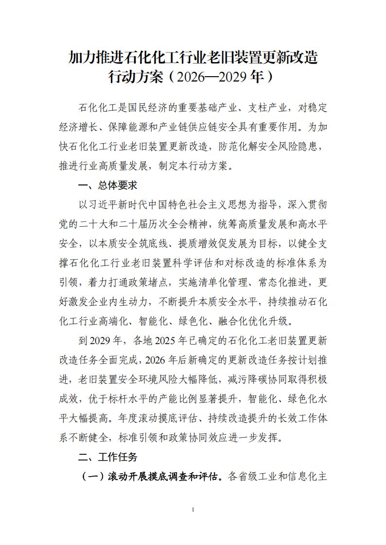《加力推进石化化工行业老旧装置更新改造行动方案(2026—2029年)》